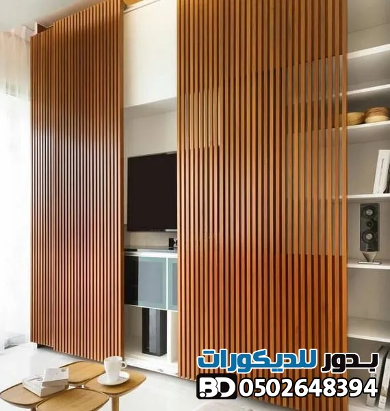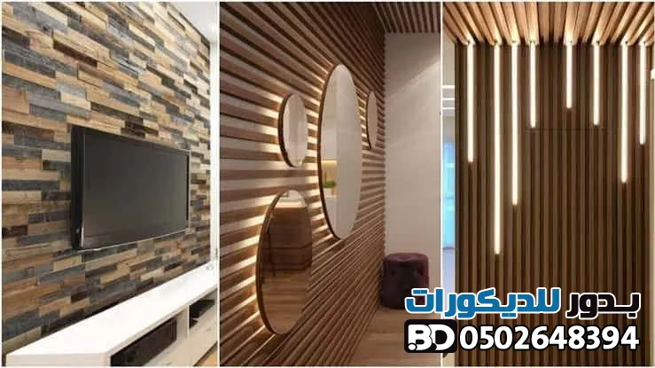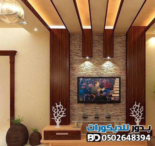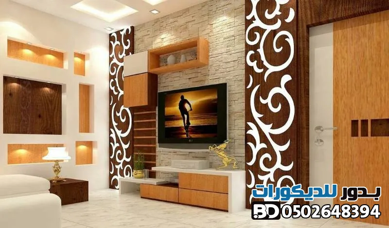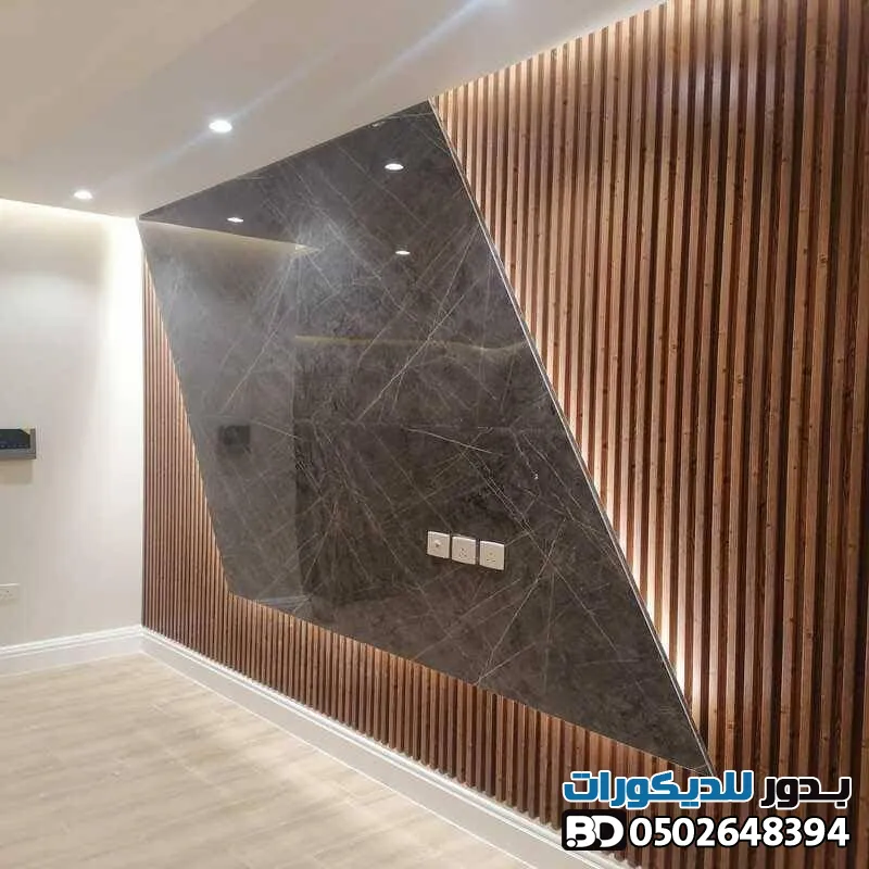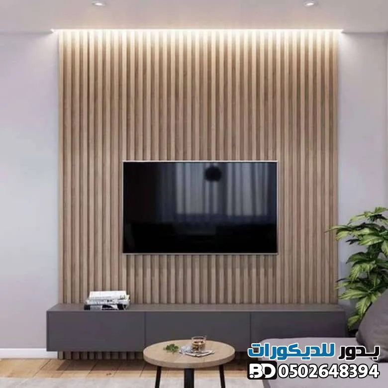 - خلفيات الشاشات : دمج بديل الخشب مع الإضاءة المخفية (LED) وشرائح الاستيل لخلق زاوية بصرية مذهلة.