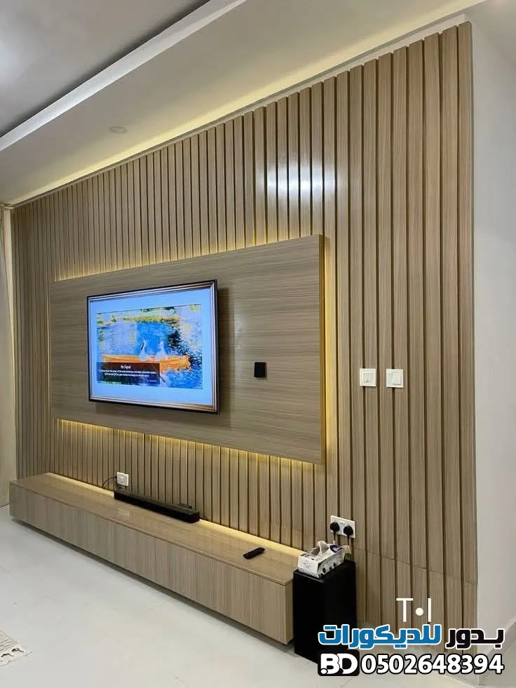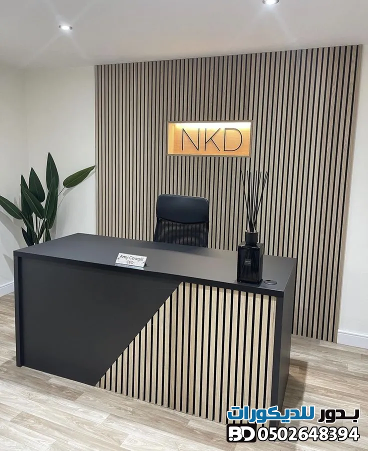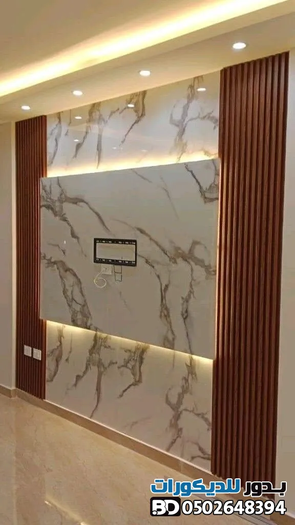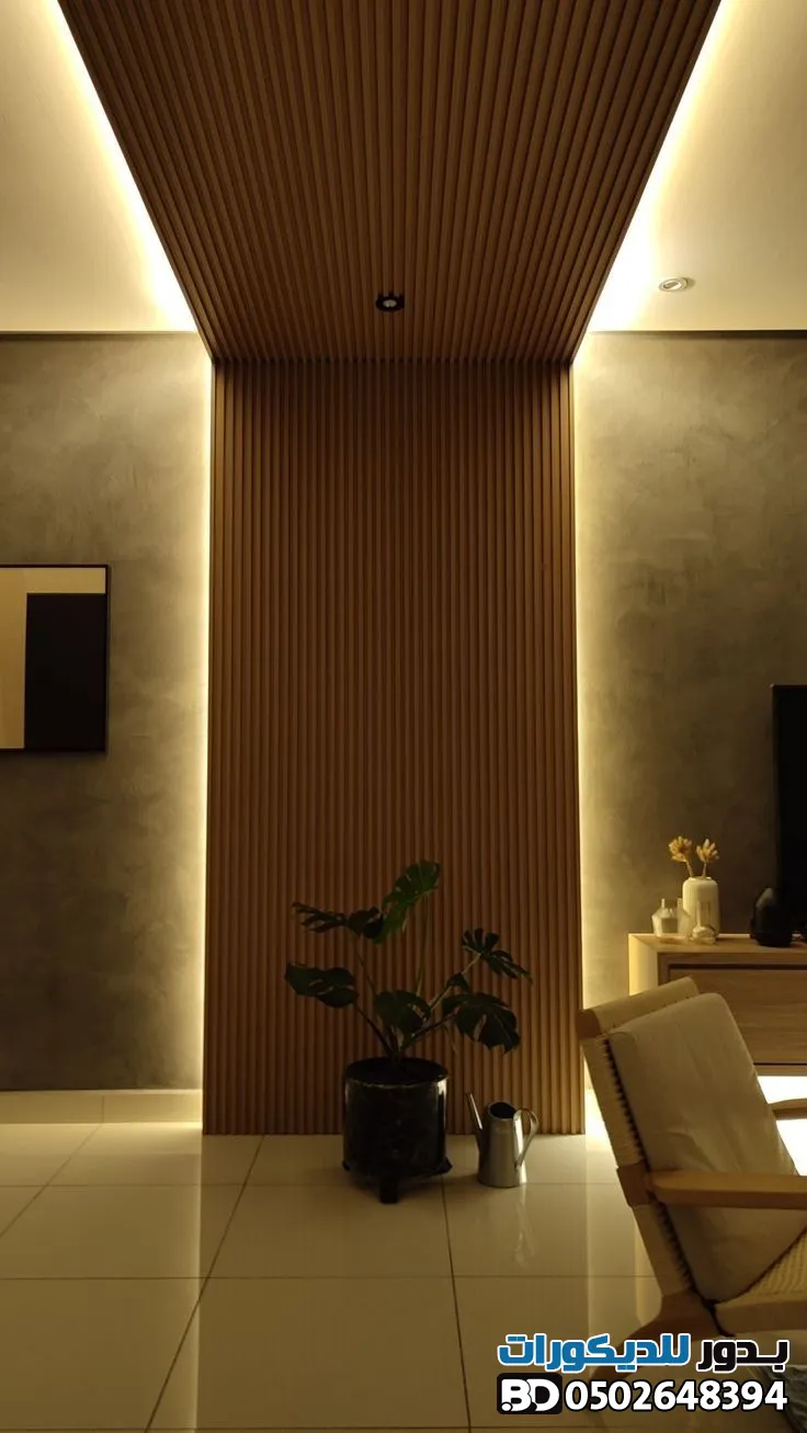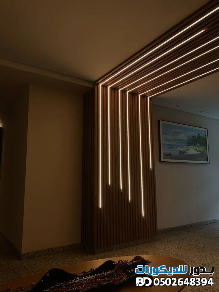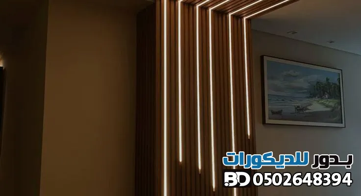 استخدام بديل الخشب وشرائح الاستيل الذهبية أو الفضية لإضافة لمسة عصرية على جدران الصالات والمجالس.